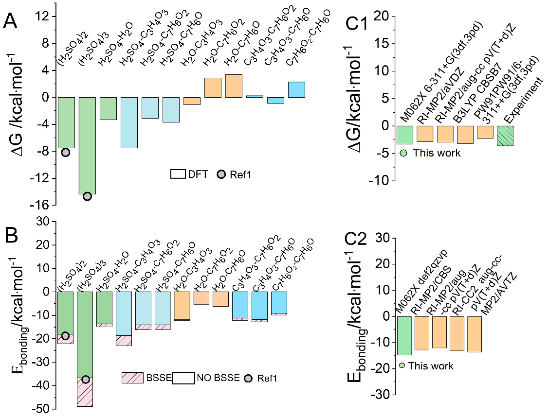 图2A为密度泛函理论热力学计算结果,其中,水和硫酸、水和丙酮酸之间表现出热力学有利的吉布斯自由能,该结果与分子动力学结果一致。本研究的计算结果与文献理论计算、实验结果比较,表现出良好的一致性。