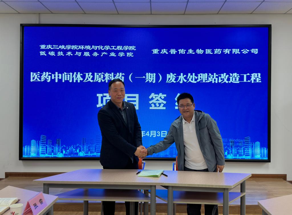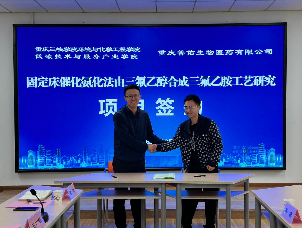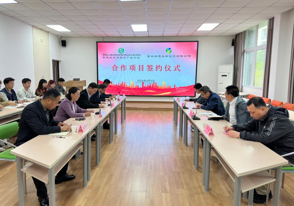 4月3日,学院举行校企合作项目签约仪式,万州经济技术开发区高新技术企业、重庆普佑生物医药有限公司总经理江涛、总经办主任谭名中等人,学校教务处副处长王广锋,环化学院党总支书记刘健、副院长黄美英、相关项目负责人出席。
