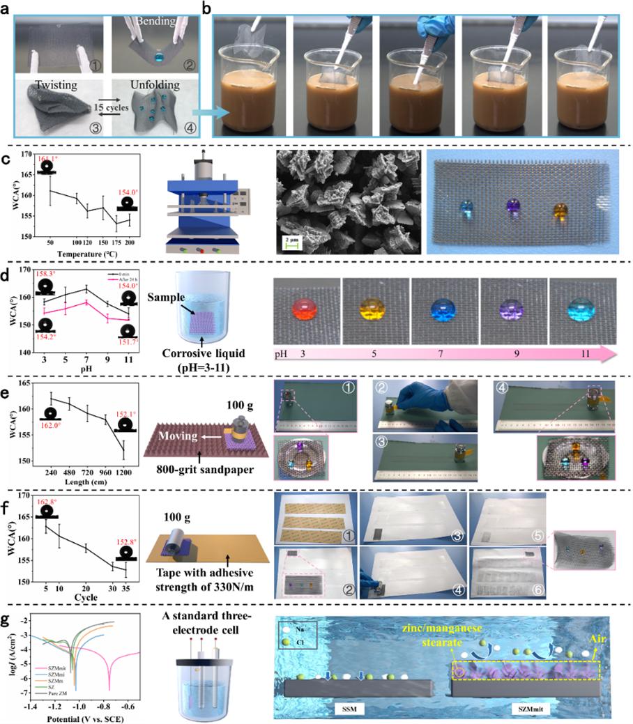 对材料进行了一系列力学和耐用性测试,SZM不锈钢网表现出长效耐久性。尤其是,优化镀层(SZMmit)的腐蚀保护效率可达90.8%。耐腐蚀的增强归因于Cassie-Baxter非润湿接触和低表面能材料的协同效应。一方面,径向生长的微/纳米六方片簇状结构在腐蚀介质和镀层表面之间捕获大量空气,形成保护性气垫屏障。这种屏障增加了液体-空气界面面积分数,显著减少了腐蚀介质与表面的接触。另一方面,生成的硬脂酸锌/锰表面降低了镀层的表面能,有效减少了腐蚀性液体的润湿。此外,空气膜可以作为纯平行板电容器的电介质,阻止腐蚀介质和镀层之间的电子传输,大大增强了SZMmit不锈钢网的耐腐蚀性。