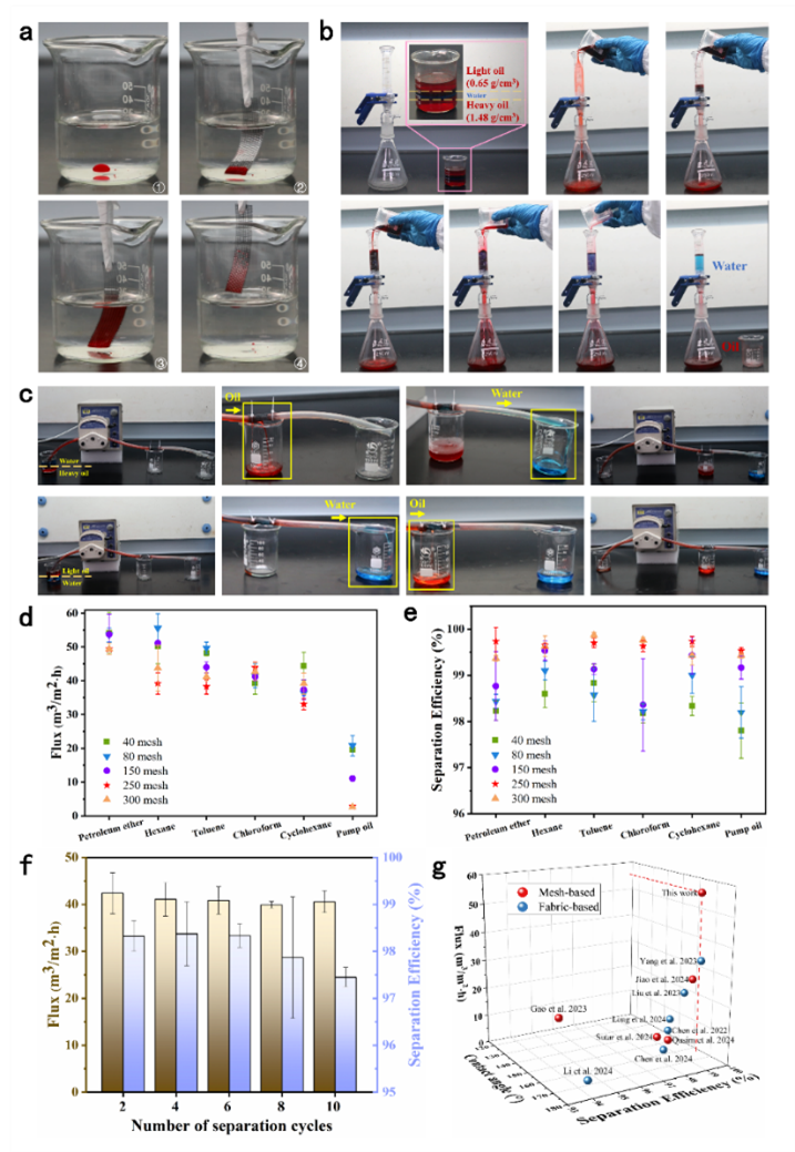 在油水分离过程中,跨膜传质系数与有机液体的粘度和分离膜本身的性质有关。具有较低粘度的有机液体表现出较高的跨膜传质系数,从而产生更大的油通量。同样地,目数较小的不锈钢网孔径越大,油通量越高。即使是高粘度油,SZMmit不锈钢网的最小通量也可达到2.68 kL/m2h。不同尺寸的SZMmit不锈钢网对各种油水混合物的分离效率均可保持在97%以上。此外,SZMmit不锈钢网经过10次分离循环后,通量仍超过40.58 kL/m2h,分离效率高达97.45%,凸显了SZM不锈钢网优异的可重复使用性。