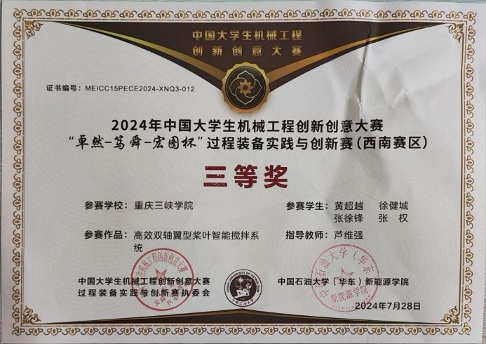 7月14—16日,中国大学生机械工程创新创意大赛“卓然-笃舜-宏图杯”过程装备实践与创新赛西南赛区决赛在四川轻化工大学举行。本次大赛吸引了近20所高校360多支团队参加、152件作品参赛。我院过程装备与控制工程专业4名同学组成的团队首次代表学校参加该赛事,凭借《高效双轴翼型桨叶智能搅拌系统》作品荣获西南赛区三等奖。