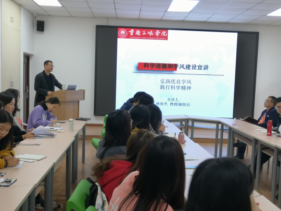 会上,学院分管科研副院长林俊杰教授首先系统介绍了本次活动宣讲内容。他结合自身经历,以“弘扬优良学风、践行科学精神”为主题为参会教师及研究生做了专题讲座,并与大家互动交流,使大家认识到科研之路不仅要坚持科学精神,更要遵守科研规范,维护科研的严密性和规范性。