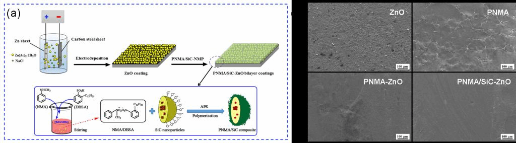 针对上述问题,9728太阳集团,9728见好就收才是赢青年教师胡传波博士采用阴极电沉积法在碳钢基体制备强附着性ZnO薄膜,然后将化学氧化聚合法制备的易加工性聚N-甲基苯胺(PNMA)和PNMA/SiC复合材料通过共溶法沉积在ZnO表面,分别得到具有p-n结的强附着性PNMA-ZnO和PNMA/SiC-ZnO涂层。研究结果表明,相比于PNMA涂层表面大小不一的裂纹和成膜的不均匀性,PNMA-ZnO和PNMA/SiC-ZnO涂层具有良好的成膜能力,且PNMA/SiC-ZnO涂层对碳钢基体的腐蚀保护效率高达97.43%。