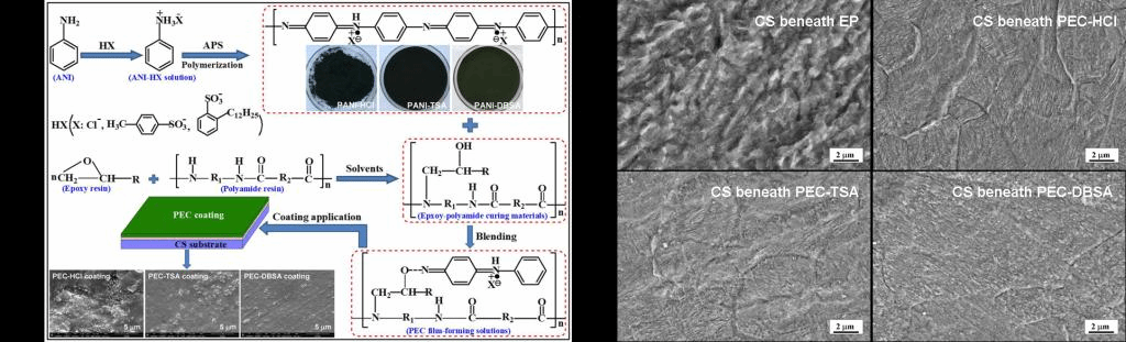 为了进一步提高PANI的可加工性和涂层的耐久性,最近我们将盐酸(HCl)、对甲苯磺酸(TSA)和十二烷基苯磺酸(DBSA)掺杂的PANI与环氧树脂(EP)通过共混喷涂的方法涂装到碳钢基体上,分别得到具有强附着性的PEC-HCl、PEC-TSA和PEC-DBSA涂层。研究结果发现,有机酸尤其是DBSA提高了PANI的质子酸掺杂度、电子导电性和结构致密性;具有丝状纤维结构的PANI-DBSA利于其在环氧树脂中的分散。划格涂层在3.5% NaCl溶液中加速浸泡90天后,分散在PEC-DBSA涂层中的PANI填料促使碳钢表面形成均匀致密的钝化保护层。相比于EP涂层,PEC-DBSA涂层的腐蚀速率降低约90%。