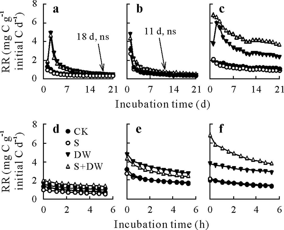 图2三个生态系统中的瞬时土壤呼吸速率(RR),在培养6小时(a-c)和21天 (d-f)的变化。森林(a、d)、草地(b、e)和农田(c、f),在不同物理干扰下,对照(CK)、过5mm筛(S)、干湿(DW)、5mm过筛+干湿(S+DW)。
