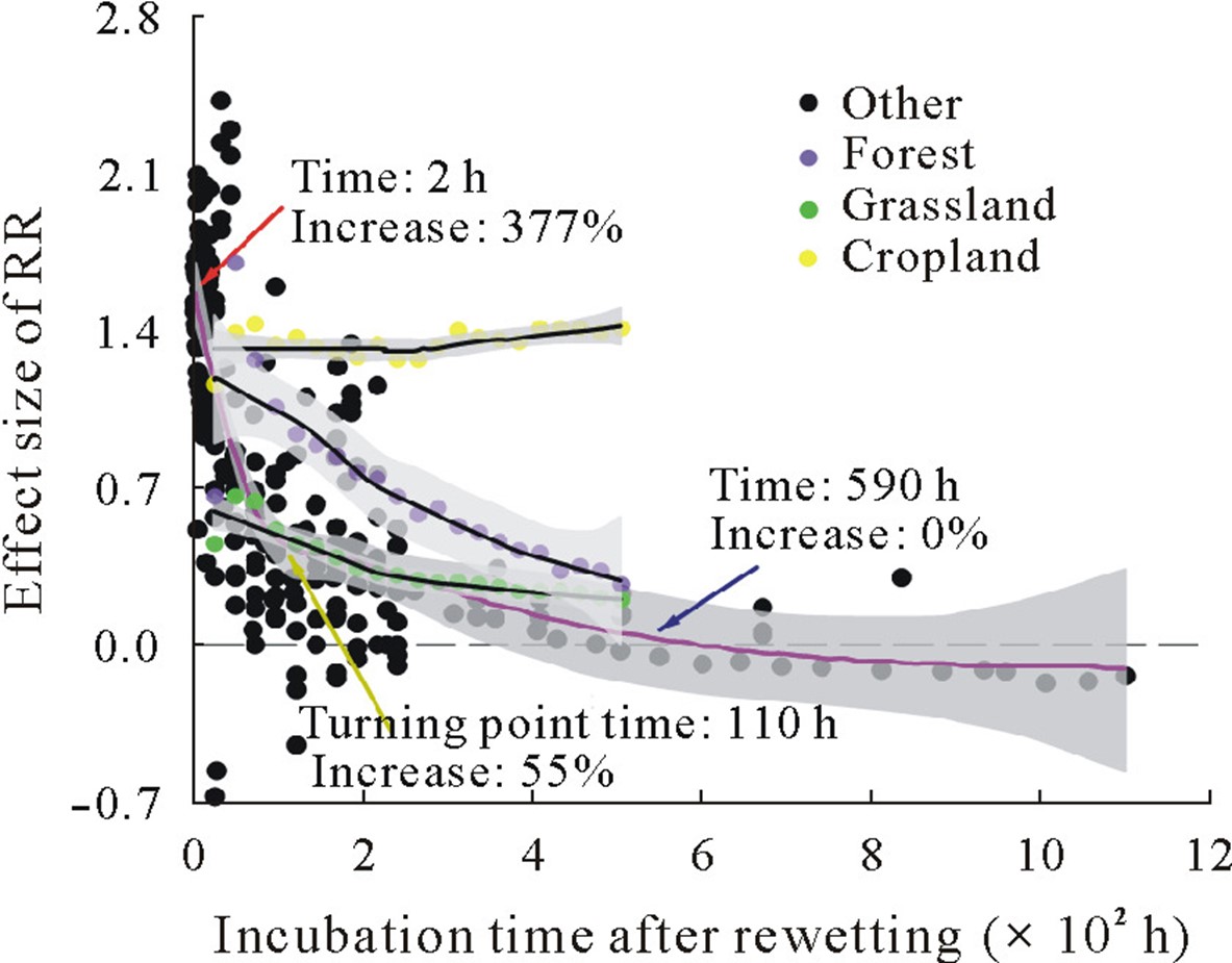 同时meta 分析表明,CO2脉冲平均维持在25天左右 (图3)。这可能与土壤有效基质和微生物生物量的减少有关。因此,当预培养时间不够长时,干湿处理对土壤呼吸速率的影响可能被高估。