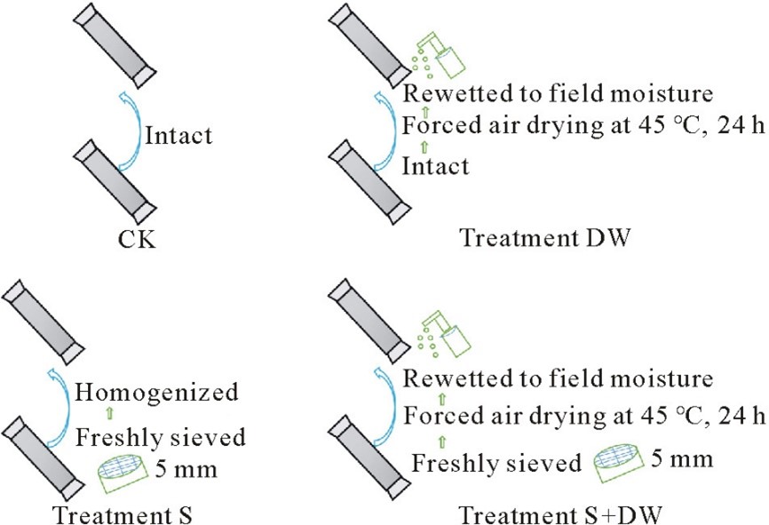 我们从加州大学圣克鲁兹分校校园收集了0-25cm的森林、草地和农田土壤。在每个生态系统中,随机选择4个位置。在每个地点用预称重的铜管(内径5cm,高25cm)收集4个原状土柱,然后立即带到实验室。将每个生态系统的16个土柱分为4组,分别进行4个处理(图1): i)无干扰控制(CK),ii)通过5mm筛(S),iii) 在45℃环境下干燥24小时,并立即复湿到采样时土壤湿度(DW),和iv) 通过5mm筛,在45℃环境下干燥24小时,并立即复湿到采样时土壤湿度(S+DW)。