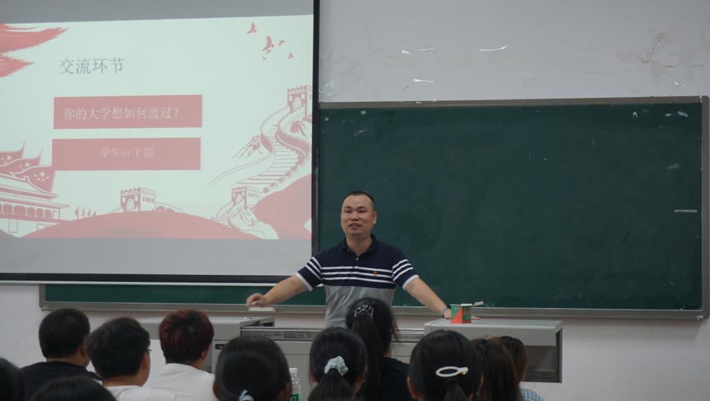 学工办副主任、2018级辅导员周强老师以“大学生活想如何渡过”向同学们提问,引发同学们对大学生活该如何渡过的思考。周强建议同学们积极参加学院或者班上干部任职,以高标准要求自己,明确“学生、管理者、策划者”身份,做好时间管理,提高综合素质。