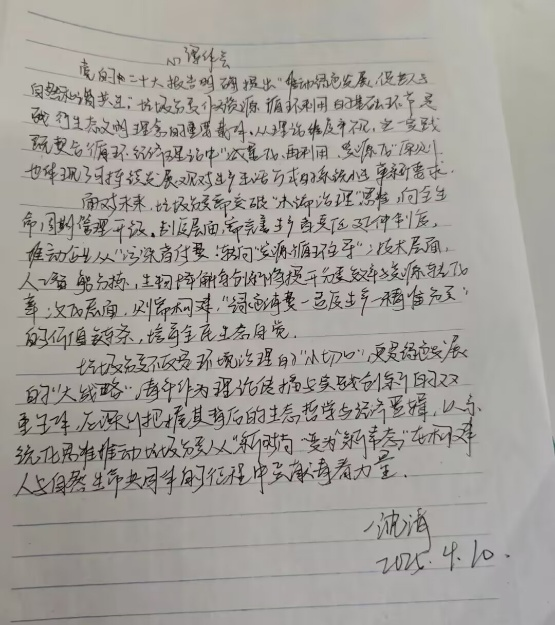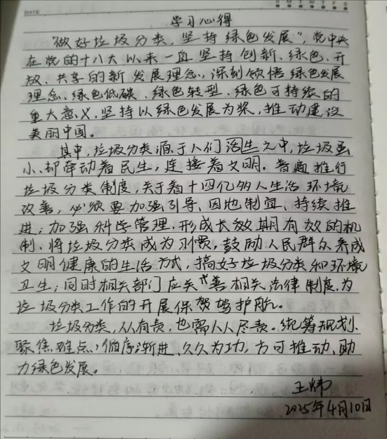 活动伊始,同学们学习“做好垃圾分类,坚持绿色发展”文章,将自己的学习笔记分享在交流群中,交流学习。入党申请人沈清入党申请人沈清表示:“垃圾分类不仅是环境治理的‘小切口’,更是绿色发展的‘大战略’,青年应深入学习其中生态哲学逻辑,助力美丽环境建设。”入党积极分子王璨入党积极分子王璨提出:“从小事做起,让垃圾分类成为生活习惯,就能为环境保护和可持续发展贡献力量。”预备党员王炜预备党员王炜认为:“垃圾分类,需人人尽责。统筹规划、循序渐进、方可推动绿色发展。”