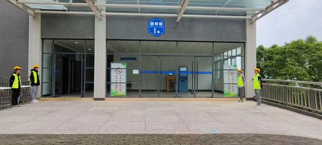 参与体验式助管执勤的志愿者们在明辨楼进行执勤。他们的黄色小马甲和笔直挺立的腰杆成了一道美丽的风景线。助管执勤的主要工作是对带便捷式早餐的同学进行劝阻,对衣着不得体的同学进行提醒,同时对上课迟到人数进行记录,统一报给生活纪检部工作人员。