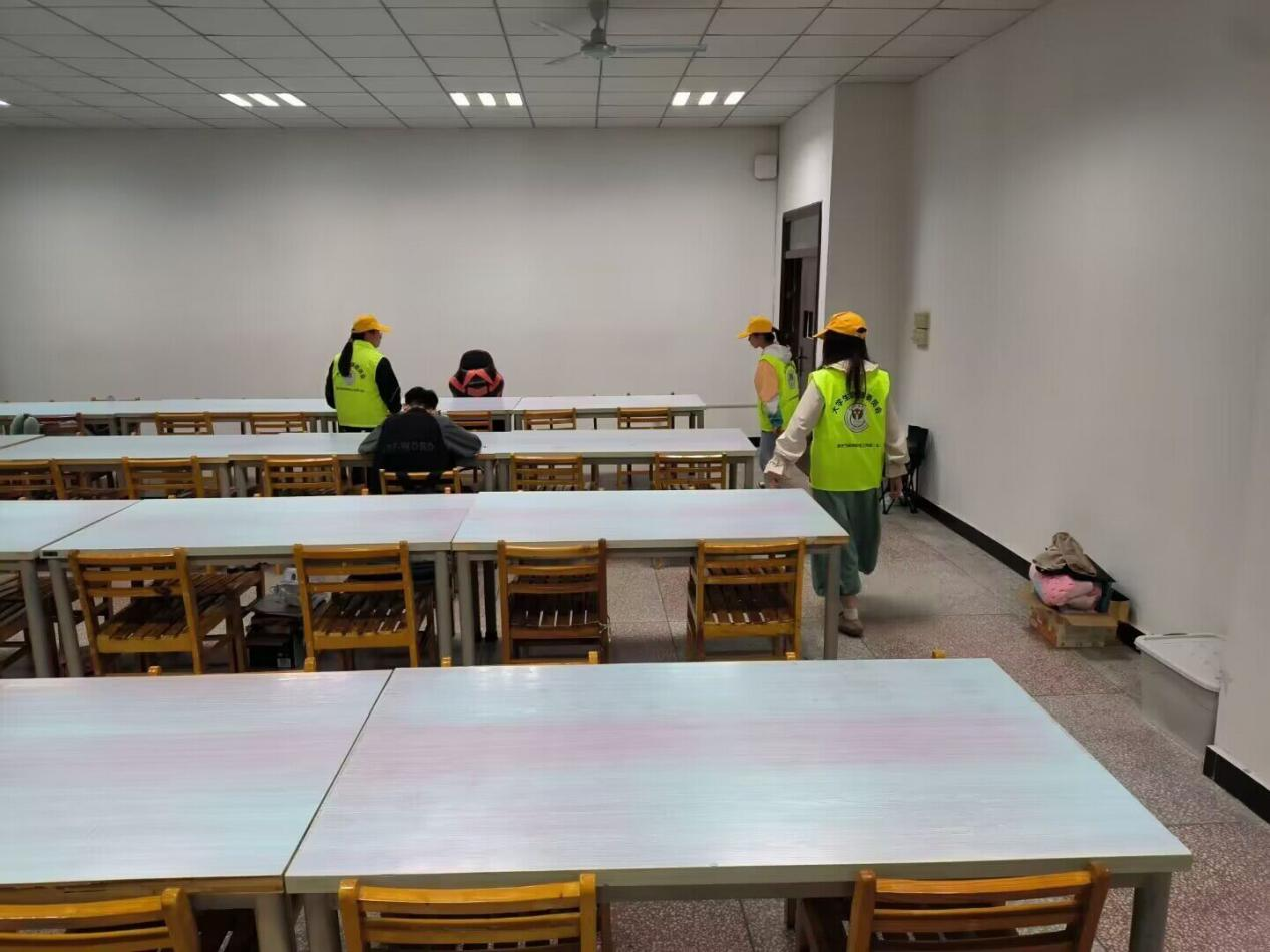 自习室清理活动由生活纪检部工作人员带头组织,主要工作是清理放在桌面上和凳子上的物品,将这些物品放置在自习室的墙边,把凳子放回原处,同时还收集好走廊的凳子,摆放在统一位置。