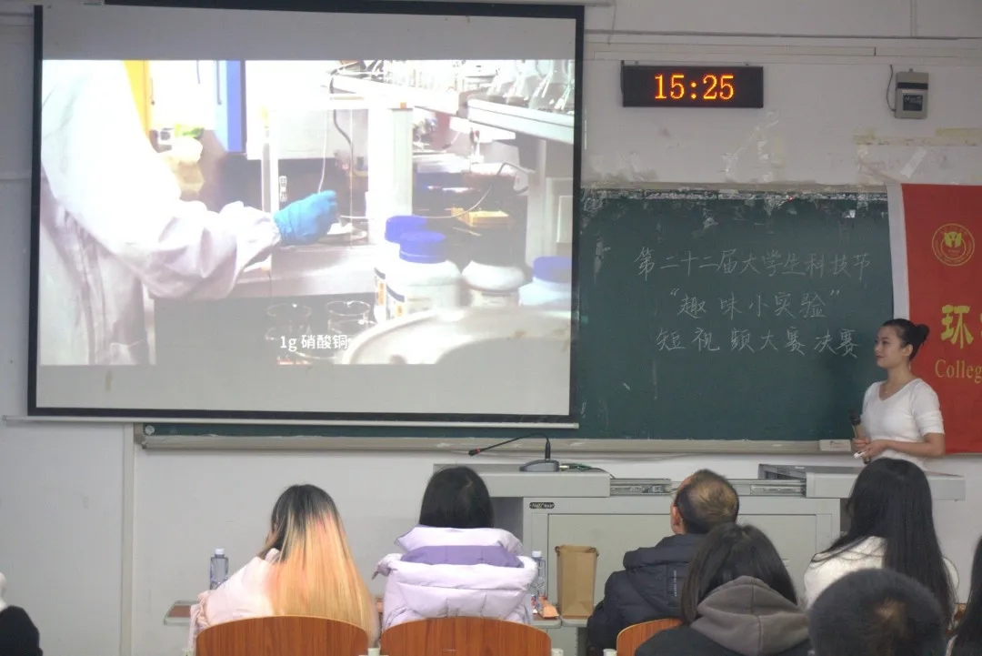 为了激发大学生的创新思维和创造力,增强实践能力,丰富课余生活,将实验与实际现象紧密联系,促进知识学习与实验操作的深度融合,9728见好就收才是赢媒体融合部于2023年12月3日下午在明辨楼1栋201举办了第二十二届大学生科技节"趣味小实验"短视频大赛决赛。学院高级实验师兼硕士研究生导师张六一、22级环境工程研究生邱子君、23级化教研究生李林林、22级学科语文研究生李明静、团总支副书记(学生)徐竹瑶出席,共计149人参加本次比赛。