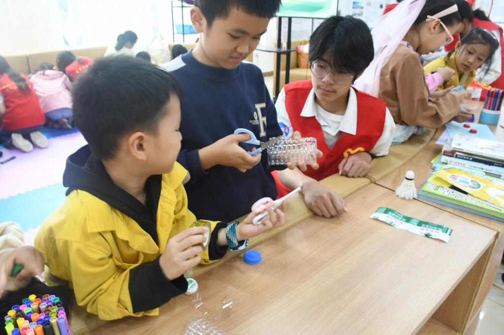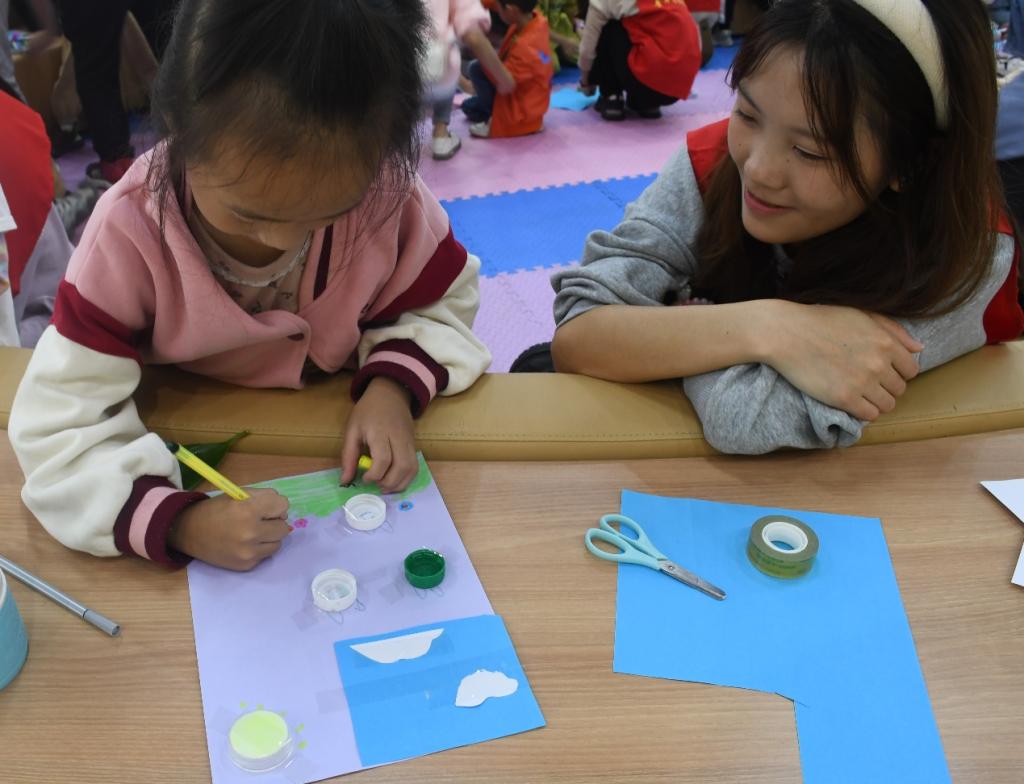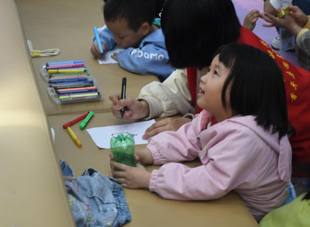 活动伊始,主讲人冯武飞以“田螺姑娘的哭泣声”为引,通过问答的形式,引导小朋友们了解保护河流的重要性并学习相应的保护方法,启发他们对河流环境问题的思考。随后,小朋友们在志愿者的协助下,利用废弃塑料瓶的瓶身和瓶盖制作了手工笔筒和环保图画,这一过程提高了小朋友们废物利用的能力。在活动的最后,小朋友们用自己的勇气和智慧战胜了破坏“田螺姑娘”家园的“怪兽”,赢得了“田螺姑娘”的奖励。