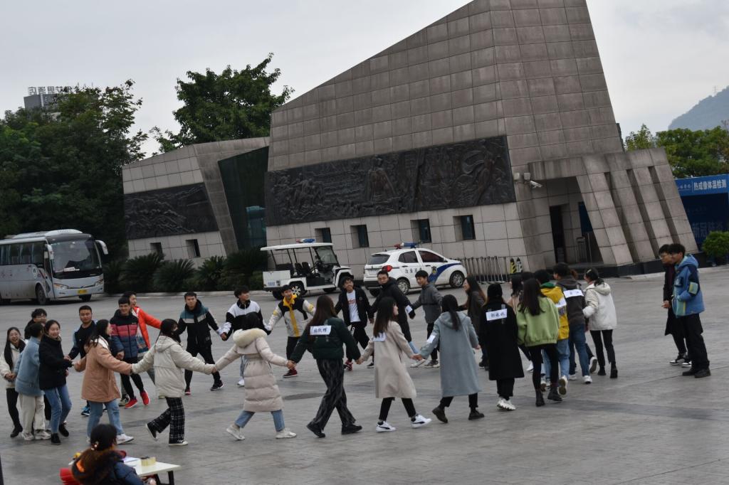 游戏1(学校正大门)——爱的抱抱。所有参赛选手围成一个大圈,手拉着手朝着一个方向转圈,直到工作人员报出一个数,大家迅速反应,没有抱在这个数字之内的淘汰,胜出的组员可以选择出发,也可以选择等待全组队员都通过了一起出发。