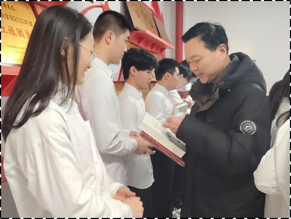 活动在激昂的《国际歌》声中启幕,全体庄严肃立。接着,学院党总支书记刘健带领新发展党员面向党旗庄严宣誓,誓言铿锵,彰显着他们对党的忠诚和为共产主义事业奋斗的决心,在场同志深受感染。然后,刘健为新发展党员佩戴党员徽章并发放书籍和笔记本,激励他们在思想和行动上践行党的使命。