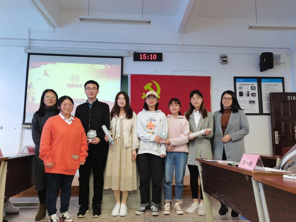 活动伊始,主持人讲解比赛规则与活动流程。活动过程中,每一位党员同志都积极参与答题,现场角逐激烈,由于第二组和第三组的分数相同,所以比赛进入加时赛环节,由党支部书记肖红现场出题,两组成员摩拳擦掌,异常激烈,也将本次比赛推向了高潮。三轮比赛后,“一路同行队”获得了第一名,“不忘初心队”获得第二名。活动最后,党总支副书记代小菊和学生第二党支部书记肖红分别给两支获奖队伍颁发奖品并合影留念。