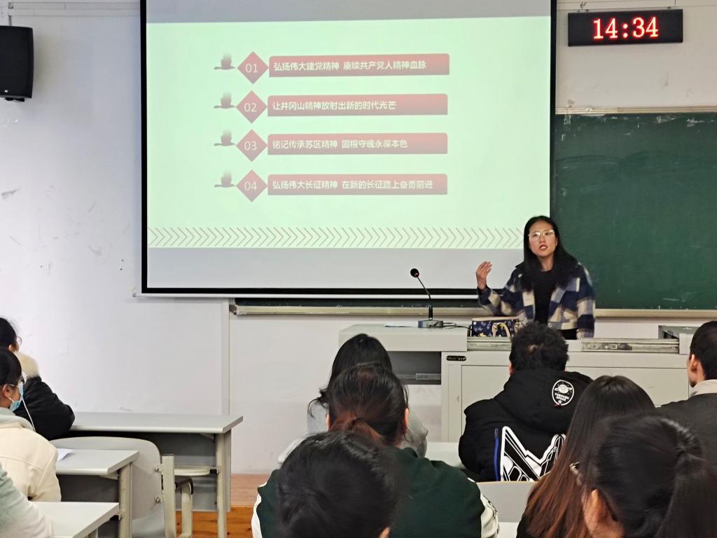 肖红围绕“弘扬伟大建党精神赓续共产党人精神血脉,让井冈山精神放射出新的时代光芒,铭记传承苏区精神、固根本色永葆本色,弘扬伟大长征精神、在新的长征路上奋勇向前”四个方面展开。她希望全体党员牢记“坚持真理、坚守理想、践行初心、担当使命、不怕牺牲、英勇斗争、对党忠诚、不负人民”的32个字的伟大建党精神,在日常学习、工作和生活中锤炼品格,增强担当,争做优秀的共产党员。