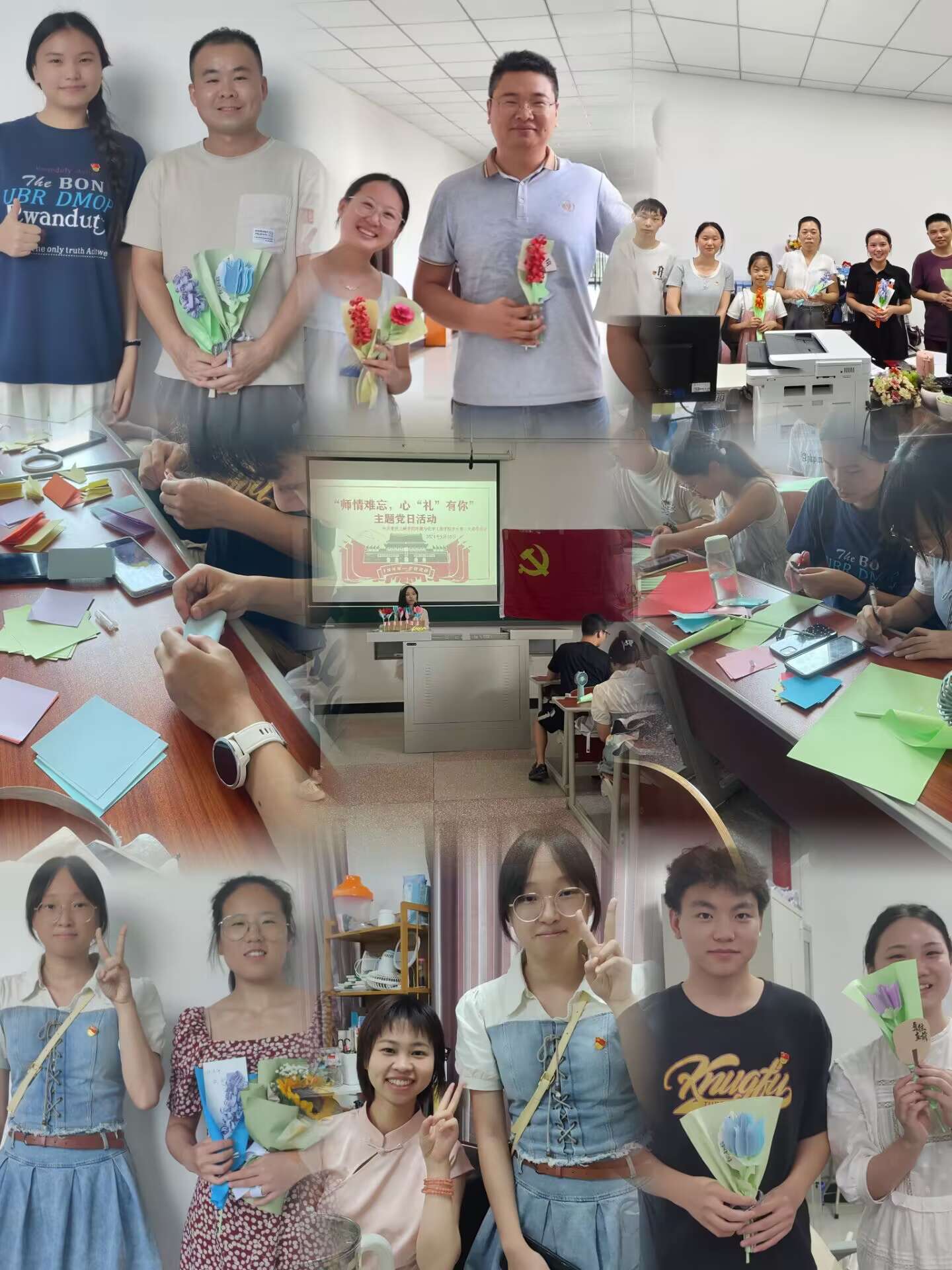 接下来的环节充满了温暖与创意。党员们分组协作,大家齐心协力,用手工卡纸精心制作花束。一双双巧手将卡纸折叠、卷曲、绑扎,原本平凡的卡纸渐渐变成了一束束充满爱意的精美花束。与此同时,党员们还在精心准备的贺卡上,一笔一画地写下对老师们的节日祝福和诚挚问候。这些充满深情的花束和贺卡被一一献给学院的老师们,老师们接过礼物时,脸上洋溢着欣慰和感动的笑容。最后,党员们与老师们亲切地合照留念,用镜头定格下这一充满温馨与敬意的瞬间。