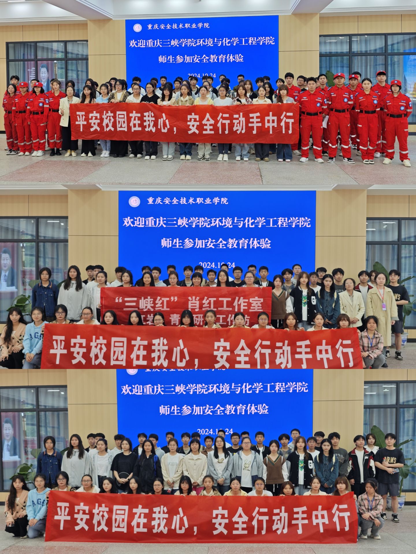 在金秋送爽的美好时节,为深化学生对安全重要性的认识,环化学院与“三峡红”肖红工作室于10月24日携手,在重庆安全技术职业学院的公共安全体验馆成功举办了一场主题为“平安校园在我心,安全行动手中行”的安全体验活动。此次活动旨在通过实践教学,提升学生的安全素养,共有约60名青年学子积极参与,共同探索安全知识的奥秘。