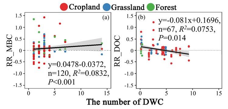 很多研究探讨了DWC对整个干湿周期内的MBC和DOC的影响。然而,DWC对土壤MBC和DOC的影响仍然难以捉摸,这可能是由于生态系统类型、土壤性质和实验处理的不同所致。因此,我们使用数据整合来阐明DWC对土壤MBC和DOC的影响。