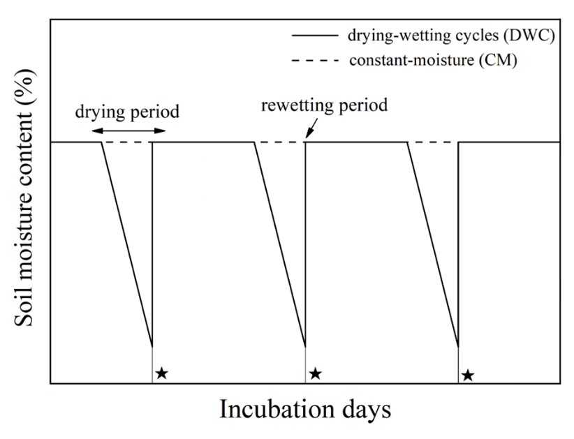 全球气候可能会显著增加陆地生态系统的干湿循环(drying-rewetting cycle, DWC)。干旱通常会降低土壤微生物的活性,减少活性底物的扩散,减弱土壤呼吸。而重新湿润可能进剩余的耐DWC胁迫的微生物同化容易获得的底物并导致土壤迅速释放大量CO2(Birch effect),因此,再湿驱动的CO2脉冲与土壤微生物生物量碳(MBC)和可溶性有机碳(DOC)响应DWC的变化密切相关。准确评估整个干湿交替周期内MBC和DOC的动态变化,对于预测全球气候变化下土壤碳动态及陆地碳循环与气候变化之间的反馈关系至关重要。