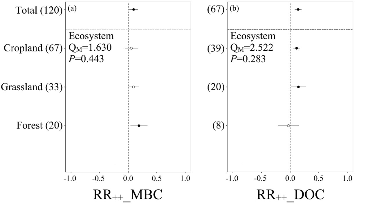 本研究基于28篇文献,获取了涵盖农田、草地、森林等生态系统的187个MBC和DOC数据(图1),采用随机效应模型(random-effects model)和混合效应meta回归模型(mixed-effects meta-regression model)等方法进行了分析。