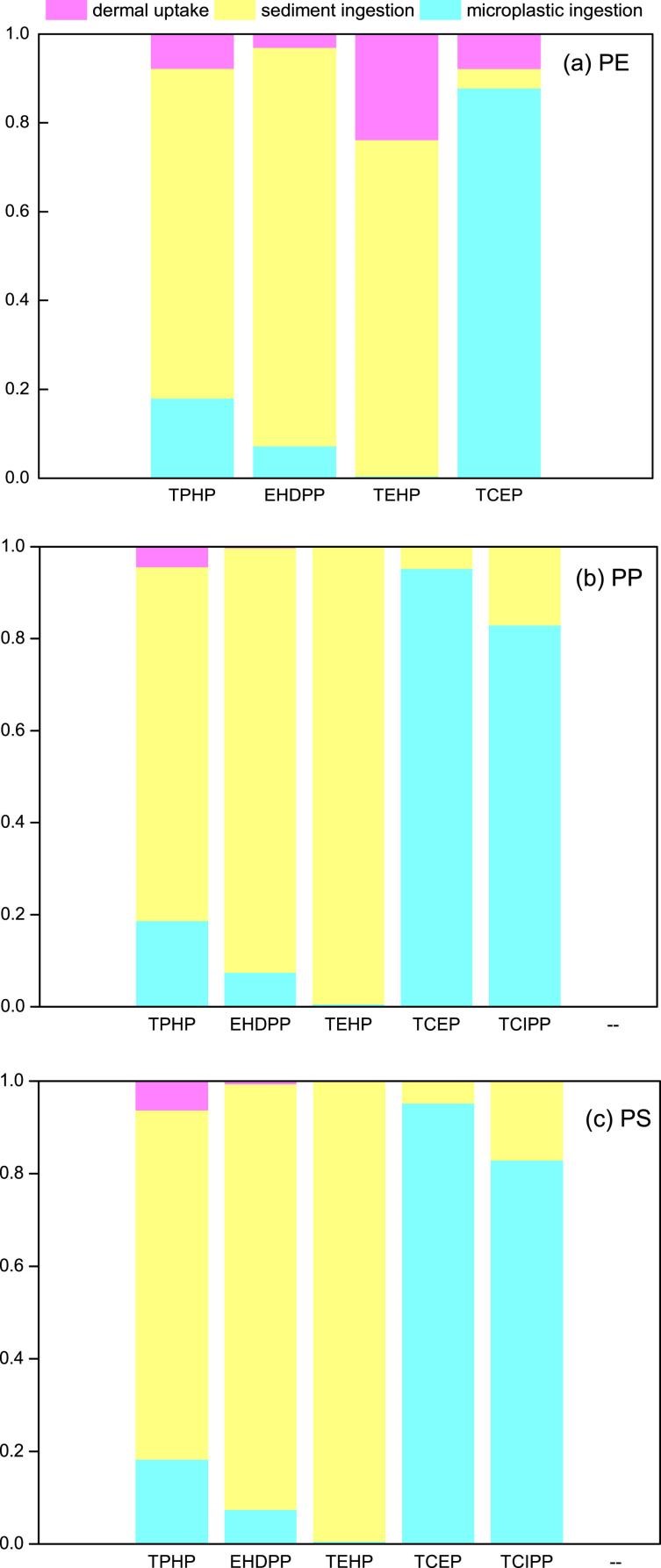 在PE微塑料-沉积物处理中,微塑料摄入对OPFRs的贡献为3~24%。这一比例明显高于含有PS和PP的沉积物样品,PS和PP的微塑料贡献分别为1.29×10-3~4.3%和7.42×10−5~1.64%(图2)。不同类型的微塑料对海蚯蚓体内OPFR的生物积累有显著不同的影响。与其他暴露途径相比,PE对TPHP、EHDPP、TEHP和TCEP在海蚯蚓组织中的生物积累的贡献以及PP和PS对TPHP在海蚯蚓组织中的生物积累的贡献是不可忽略的。