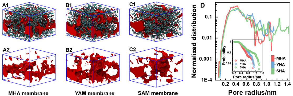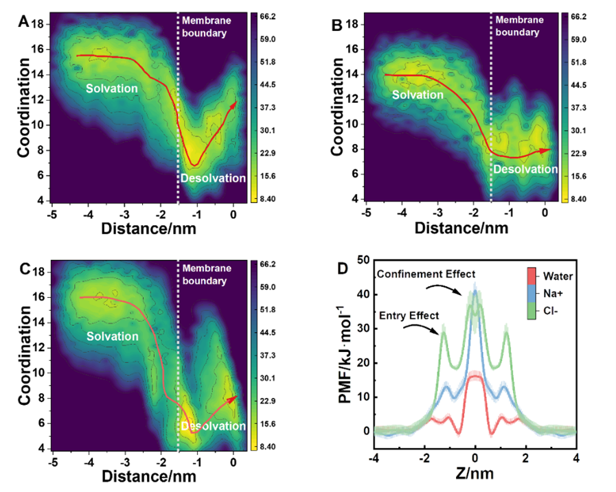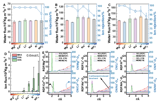 热力学结果表明,水分子和离子在腐殖酸膜中筛分遵循动态“跳跃—输运(Hopping–Transport)”机制,离子的水合能力影响其分离效率,离子水合能力降低,脱盐率下降。因此,在实现水合能力较弱的离子(如K+、NH4+、Cl−、NO3−)分离,需要考虑纳米孔或表面功能化提高分离性能。
