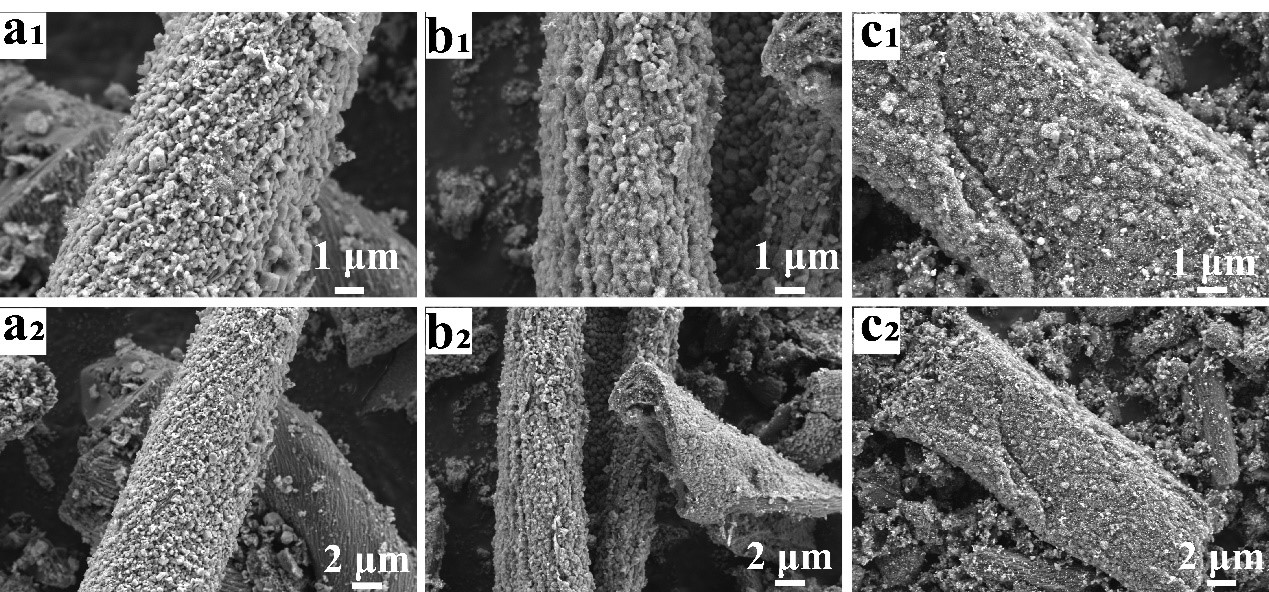 图1 ZIF-67/CCot在不同温度下碳化后的SEM。ZIF-67/CCot-7(a1,a2);ZIF-67/CCot-8(b1,b2);ZIF-67/CCot-9(c1,c2)
