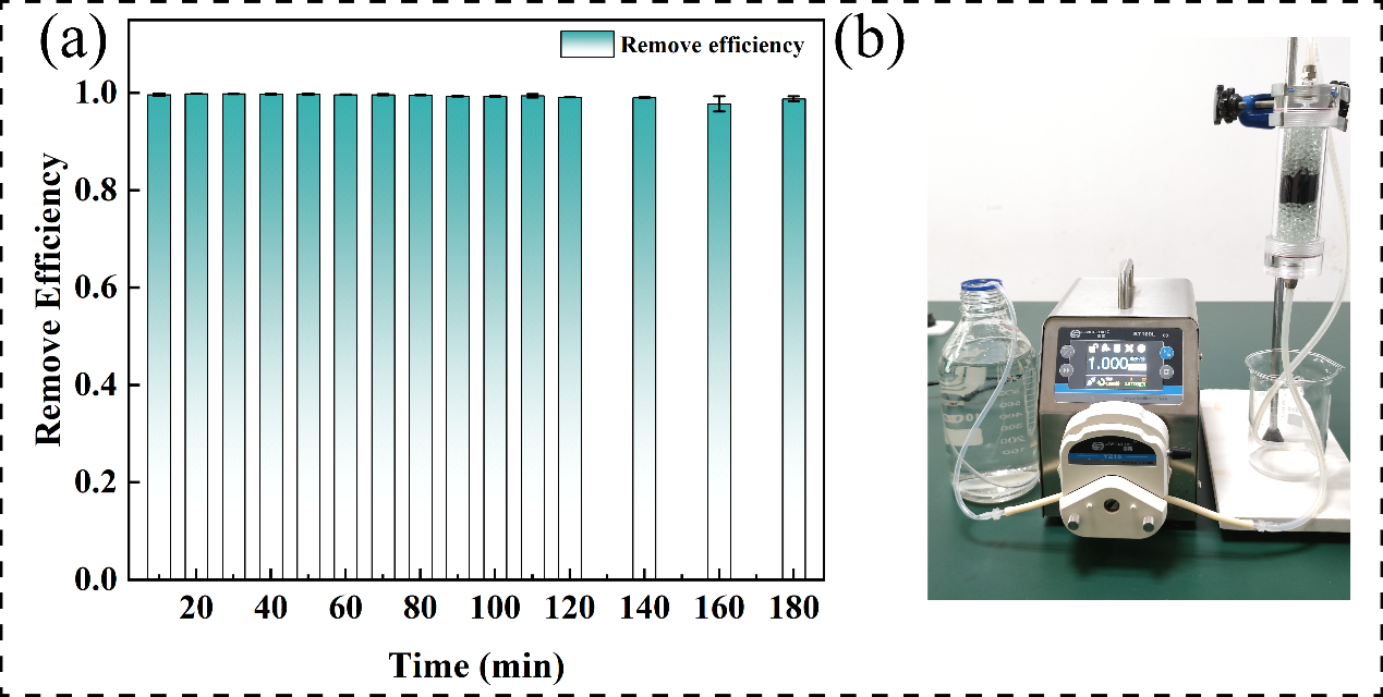 为了验证ZIF-67/CCot-8/PMS的实用性,设计了一个连续流水处理装置,如图4所示。在试剂瓶中制备含有10 mg/L CIP和2 mM PMS的溶液。采用蠕动泵作为驱动装置,在干燥管内填充0.5 g催化剂,填料长度约为2.3 cm,内径为30 mm。启动仪器后,将蠕动泵流速调整为1 mL /min。定期收集样品检测浓度。如图4所示,在反应进行180分钟后CIP去除率可达98%。这表明ZIF-67/CCot-8/PMS体系具有良好的降解性能。