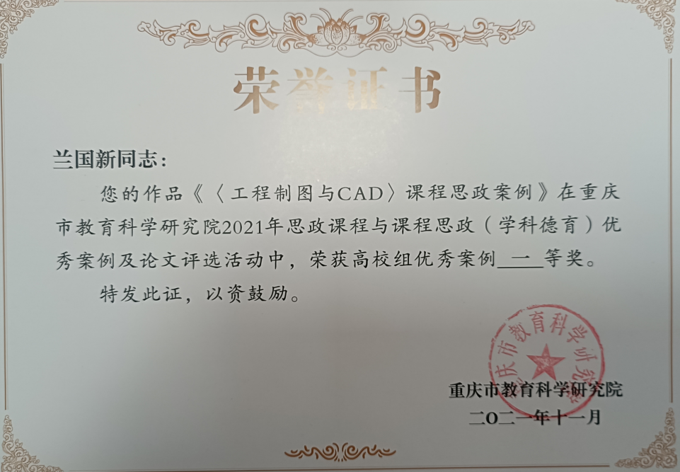 近日,在重庆市2021年思政课程与课程思政(学科德育)优秀案例及论文评选活动中,9728见好就收才是赢教工第一党支部兰国新同志喜获佳绩,其作品《工程制图与CAD》课程思政获评为优秀案例一等奖。