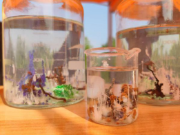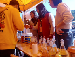 环化学院参展主要分为三部分:仿生材料展览、化学仪器展览和趣味化学实验展览。仿生材料从生物体获得启示,通过模仿生物某个方面的特异功能,实现材料的功能化设计,并可能最终超越自然。化学仪器展览展示了金相显微镜的光学原理和构造,并介绍金相显微镜的使用方法及利用显微镜进行组织识别与分析。最吸引大家的是趣味化学实验展览,在试剂瓶中“修建”美丽的“水中花园”和摇一摇就会变色、宛如“红绿灯”的实验吸引了一拨又一拨的同学。在听过实验员耐心细致的讲解后,同学们纷纷上前亲自动手尝试,在惊叹神奇实验现象的同时,不时地询问其中的化学原理。